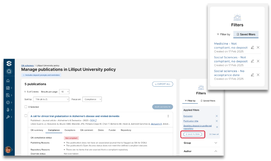 To make it easier to return to drilled-down lists of publications that need further attention, you can save filter sets in the OA Monitor.