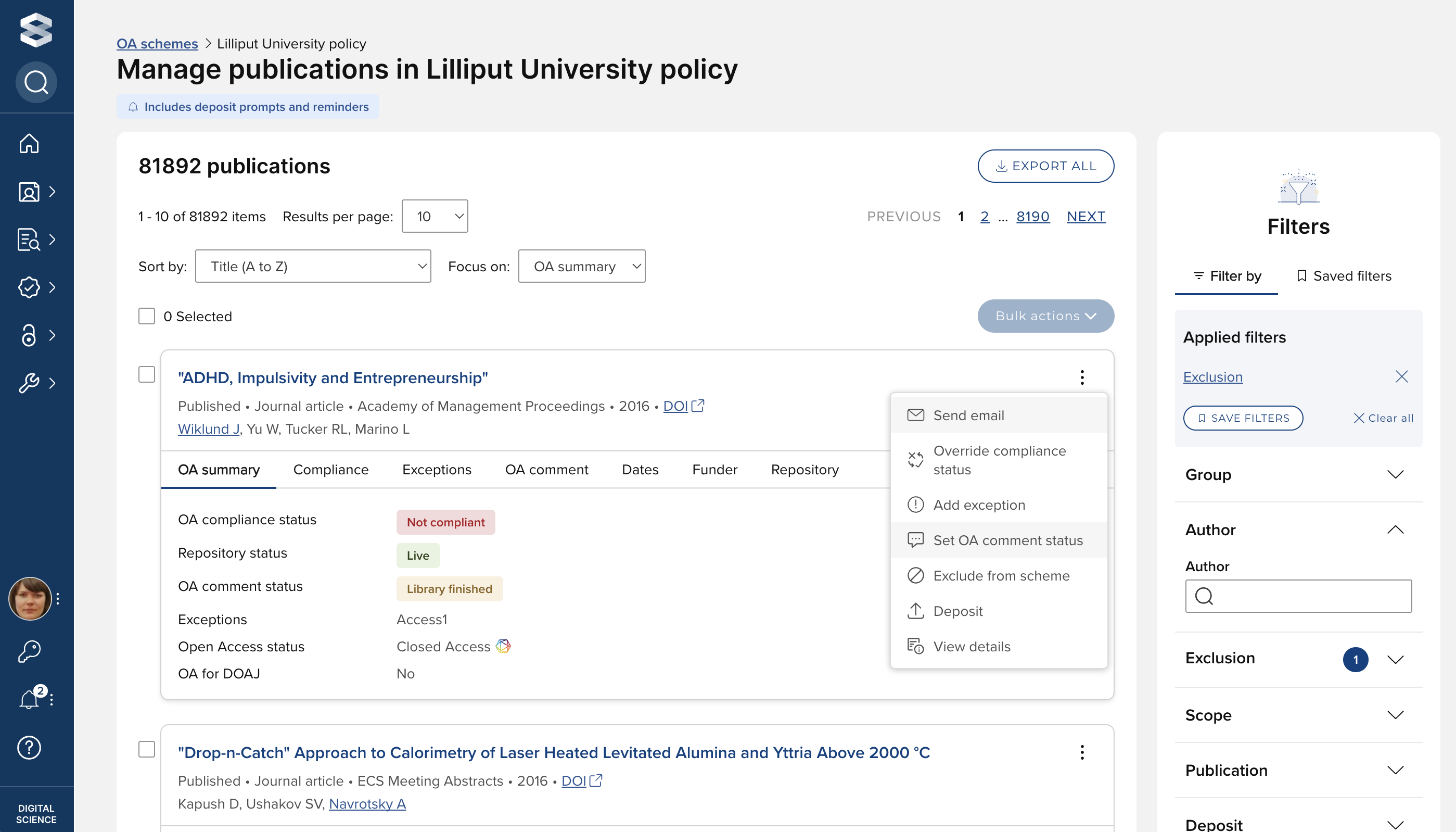 This will then open the publications list page for the OA scheme, listing all publications within scope, with excluded publications (see below) filtered out by default.