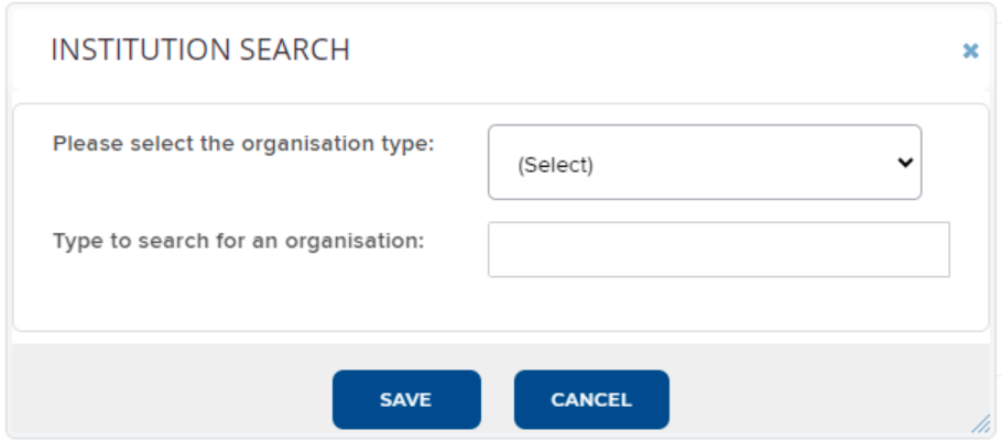 Clicking Add… opens an institution search window. The available types are ‘Partner organisation’ and ‘Sub-contracted organisation’, and the organisation search works in exactly the same way as the Institution External Source Control.