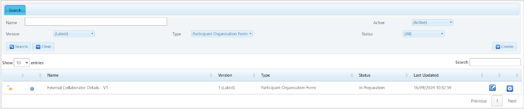 Existing form definitions with one or more external collaborator grids should be updated to add a new participant organisation control, configured to use a new participant organisation sub-form. The previous grid based configuration should be deleted from the form.