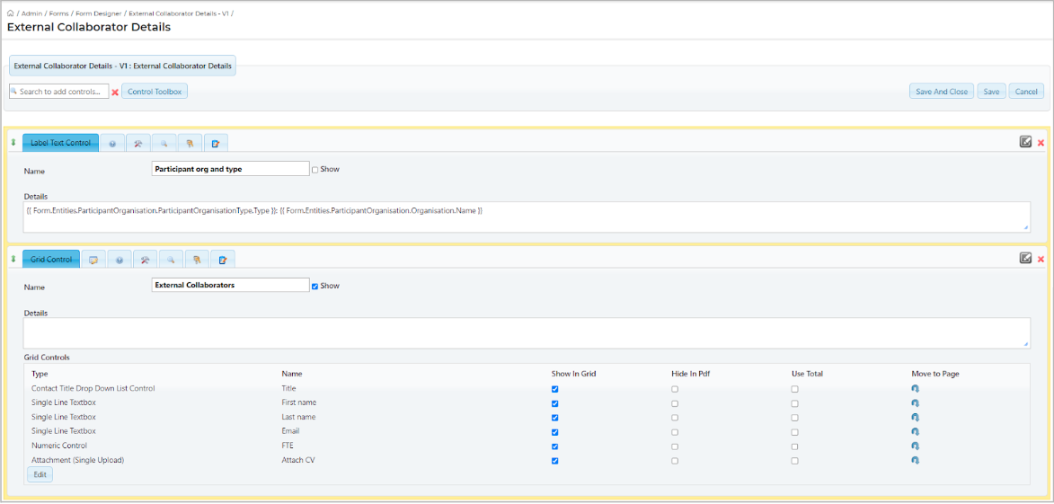 For each proposal form definition which is configured to capture external collaborator details, add the Participant Organisation Control and specify which participant organisation form definition to call.