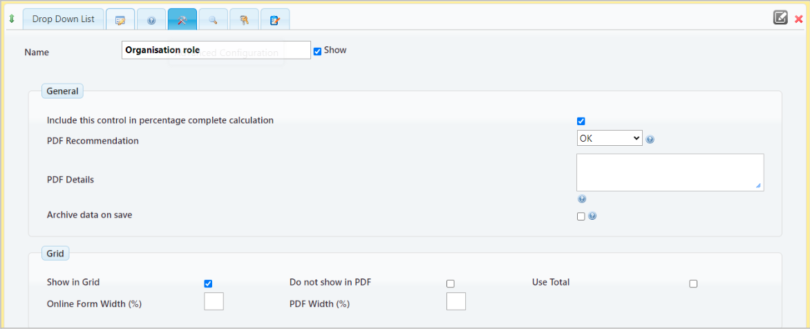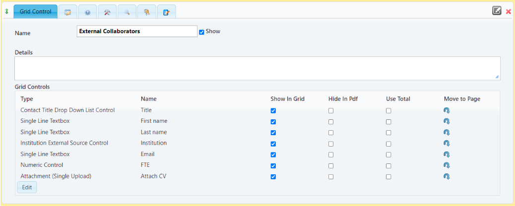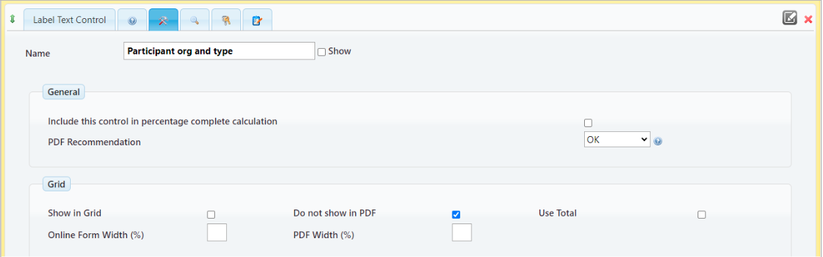 To manage which controls from a subform appear in the participant organisations grid on the main proposal form page, use the ‘Show in Grid’ checkbox. Note that this cannot be used on a Grid control, as the participant organisations control is also a grid, and the online form cannot display a grid within a grid.
