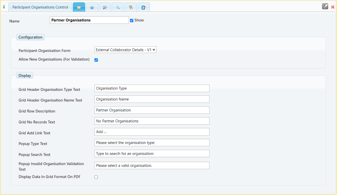 Do not check the option to ‘Display Data In Grid Format On PDF’ if the Participant Organisation form includes a Grid control.