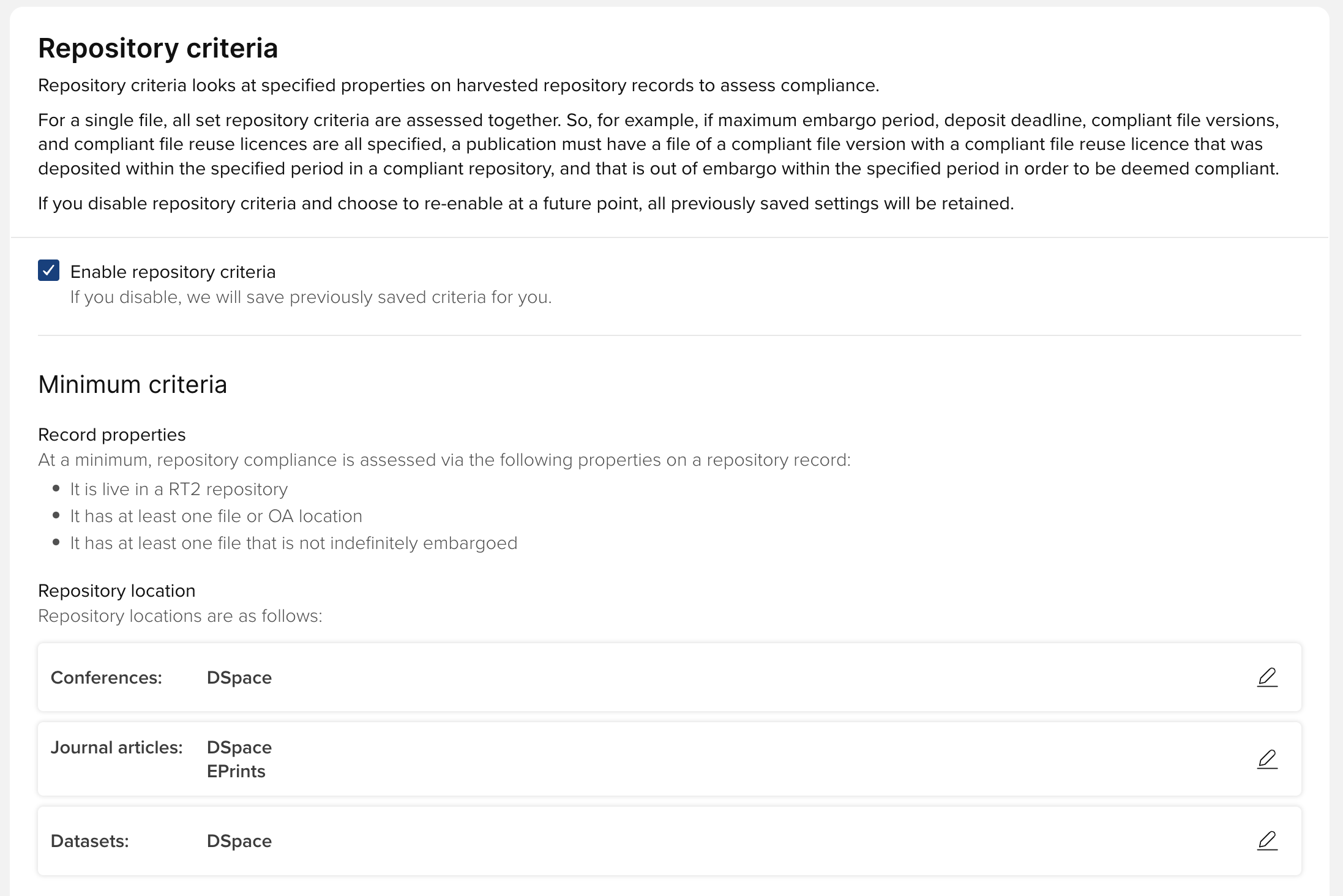 For existing OA schemes where repository location was set as a compliance criterion, upon upgrade the selected repository location will be set as the compliant repository location for each publication type.