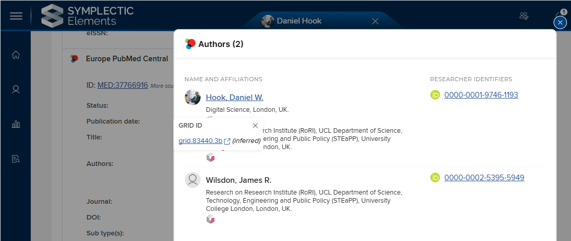 Image: An EPMC publication record, showing author affiliation GRID IDs that were inferred by searching Dimensions