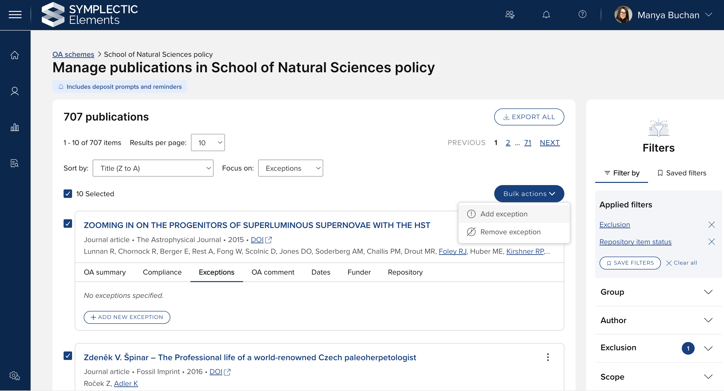In this release, we have made improvements to this behaviour to ensure that only those Exceptions that are enabled in an OA scheme are visible when managing that scheme. This means that a publication that has an Exception applied that is not enabled in the OA scheme in question will not have that Exception listed in that OA scheme.