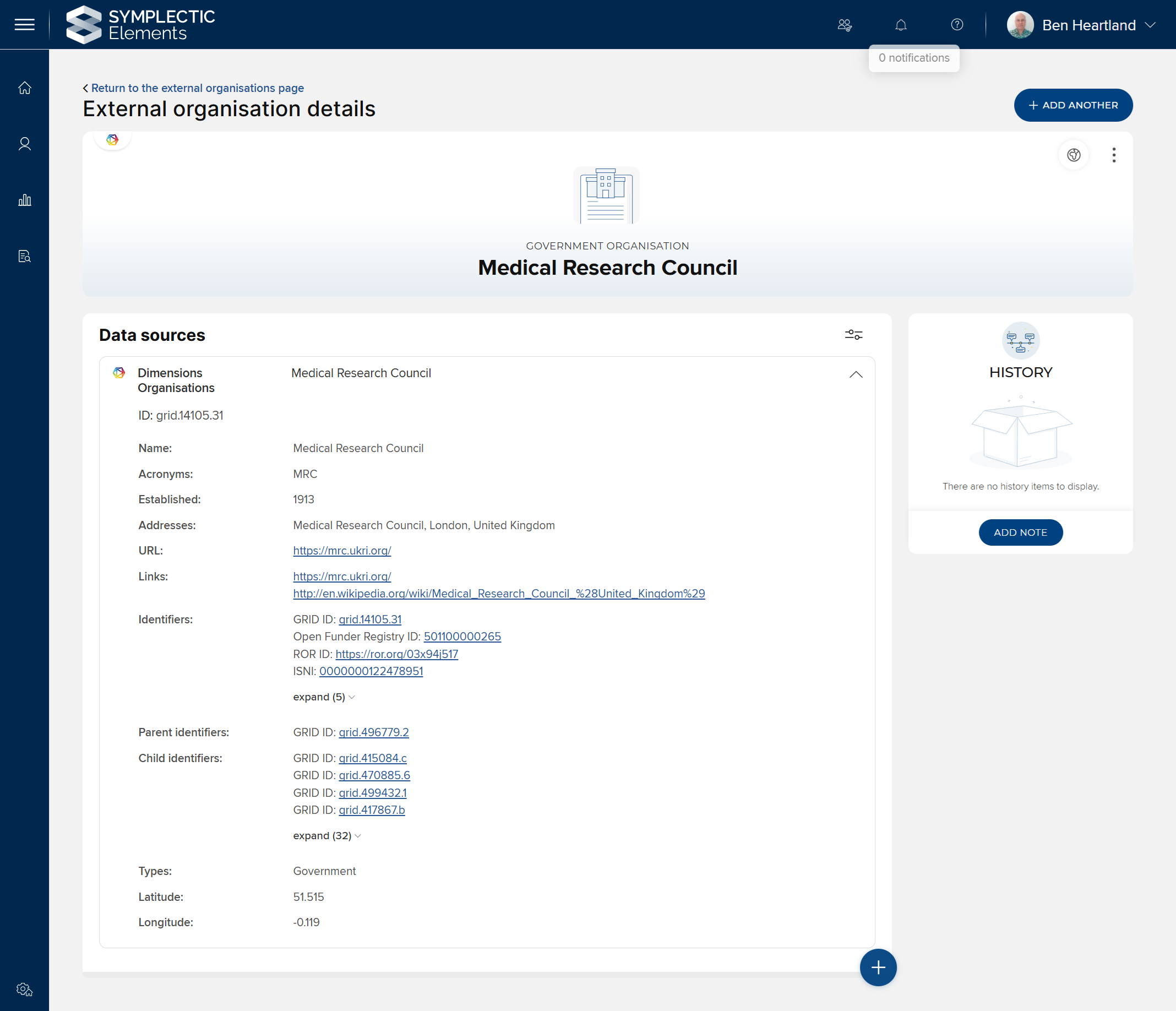 If your organisation maintains its own set of data about external organisations, this can be imported via the Elements API. If your data includes identifiers from any of the above schemes, your institutional records will be automatically matched with existing records in the system, thus avoiding duplication between your organisation's data and the data from GRID/Dimensions.