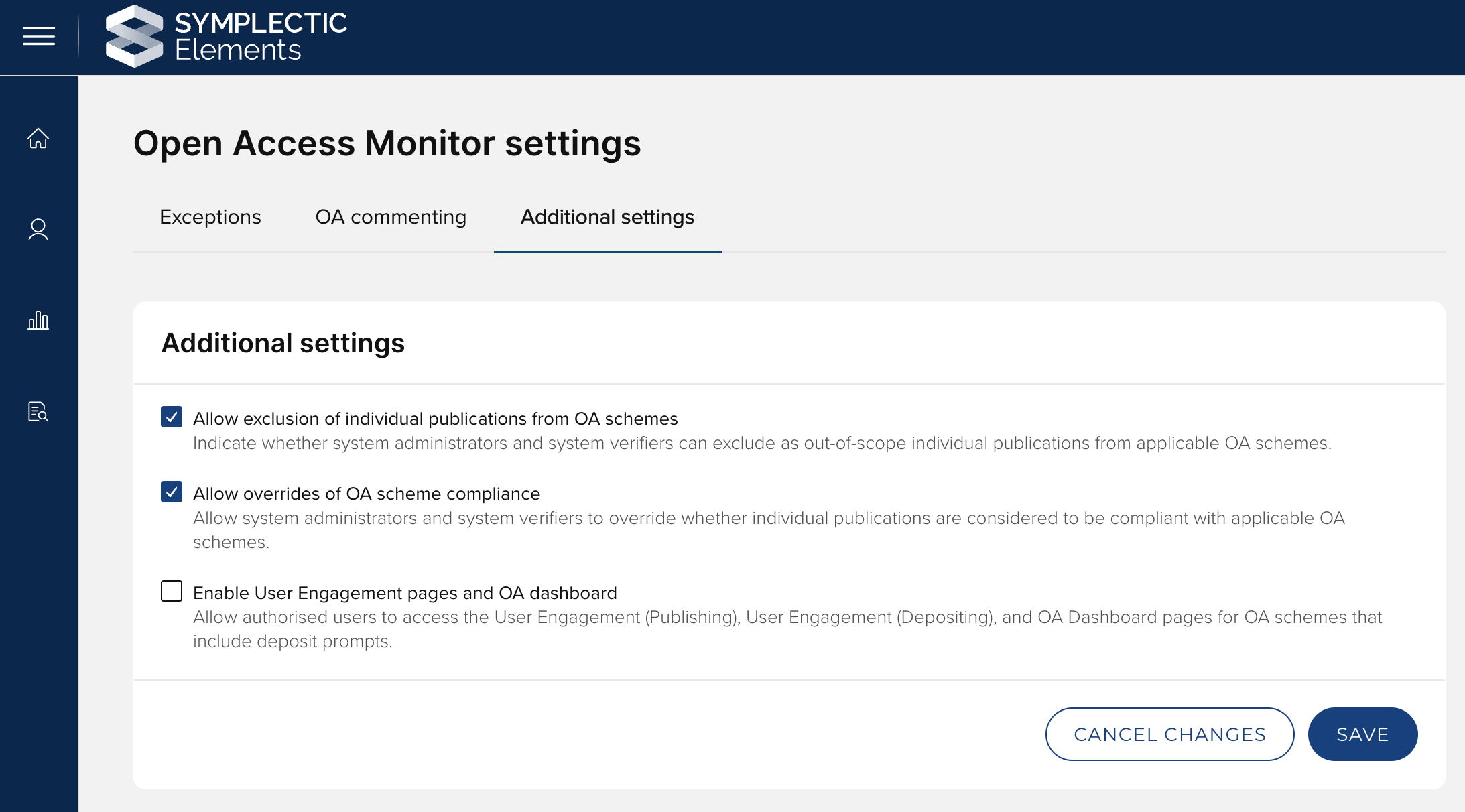 In this release, we have introduced the global facility to disable the User Engagement pages and OA dashboard, for those clients who do not wish to employ these pages. By default, these pages are enabled. To disable, go to Open Access > OA Management > OA Monitor settings > Additional settings.