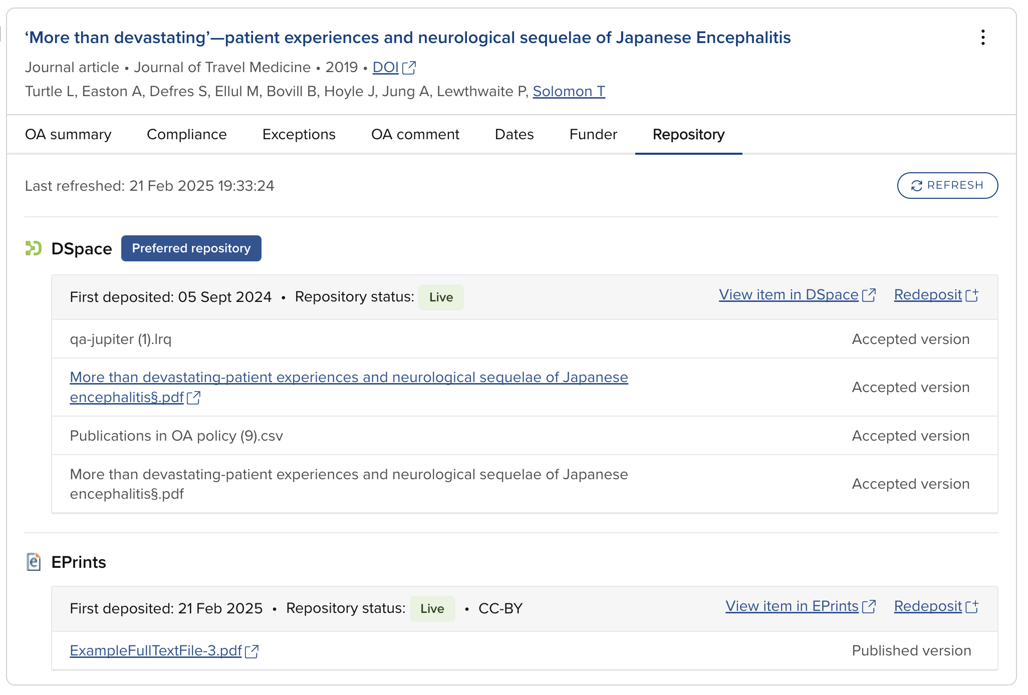 We have added a new ‘Repository’ tab to the Publication stub, giving OA Monitor users direct visibility of deposited files, repository status, version, and repository location; along with the function to deposit, re-deposit, and view the item directly in the repository.
