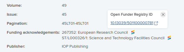 Image: Funding acknowledgements in a CrossRef publication record, including grant reference, funder name and OFR ID