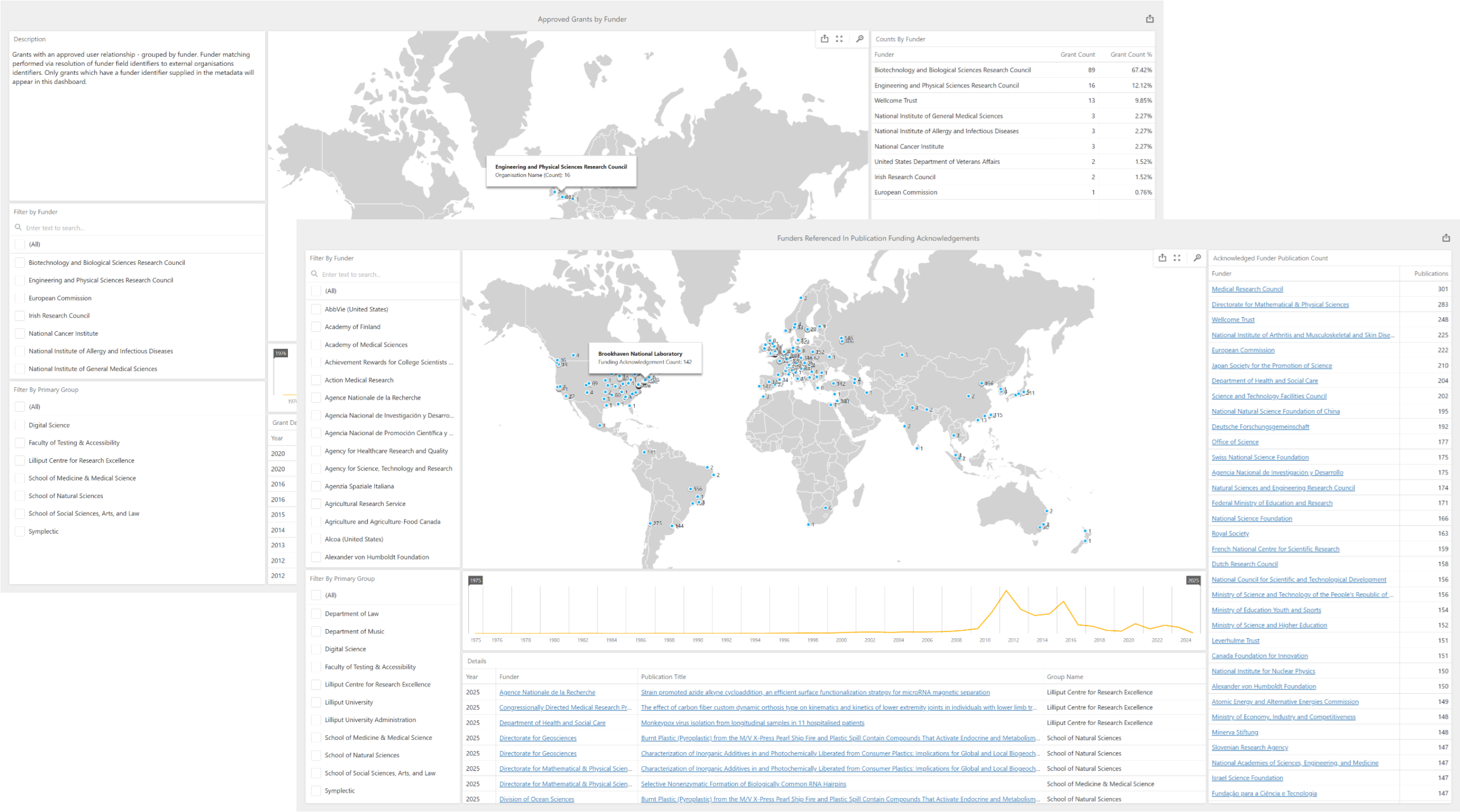 Note that these dashboards will be very sparsely populated immediately after upgrade. Over time, they will become more populated as funder identifiers are harvested from Dimensions and CrossRef.