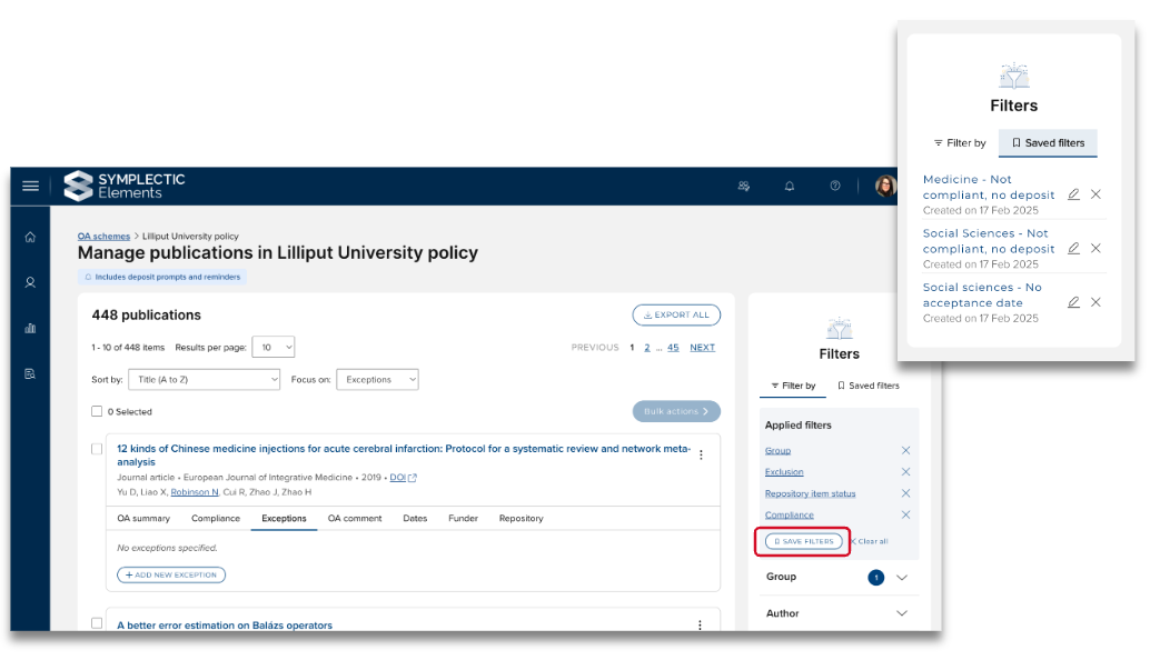 We have introduced the facility to save filter sets, making it easier for you to return to drilled-down lists of publications that need further attention.