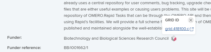 Image: A Dimensions grant record, including the funder's GRID ID in addition to the funder name