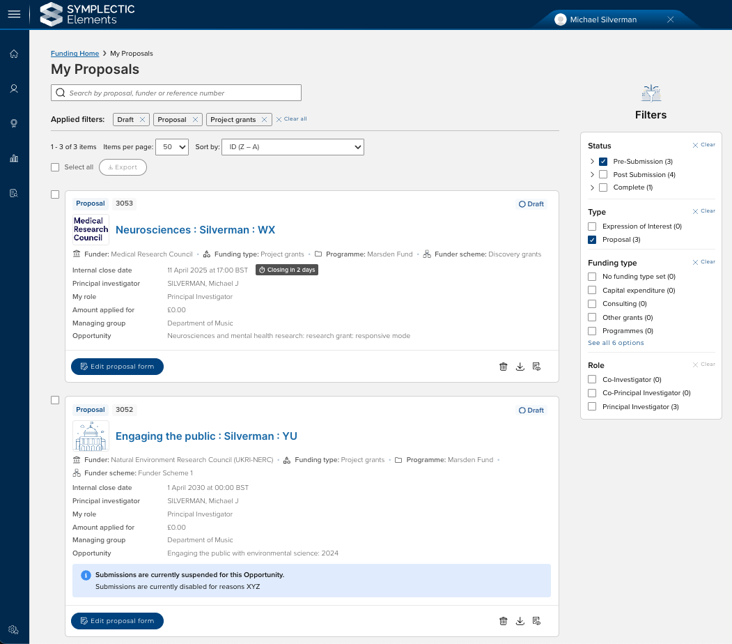Improved filtering options on list pages (e.g. Funding opportunities, My proposals)
