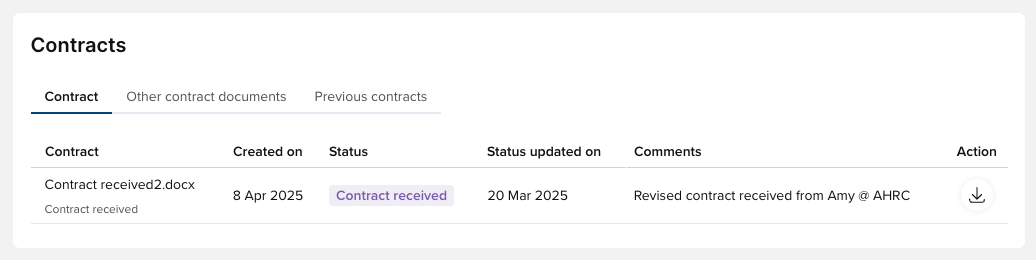 A new Contracts section has been added, giving users visibility of contract documents, their status, when submitted, etc., along with the facility to download.