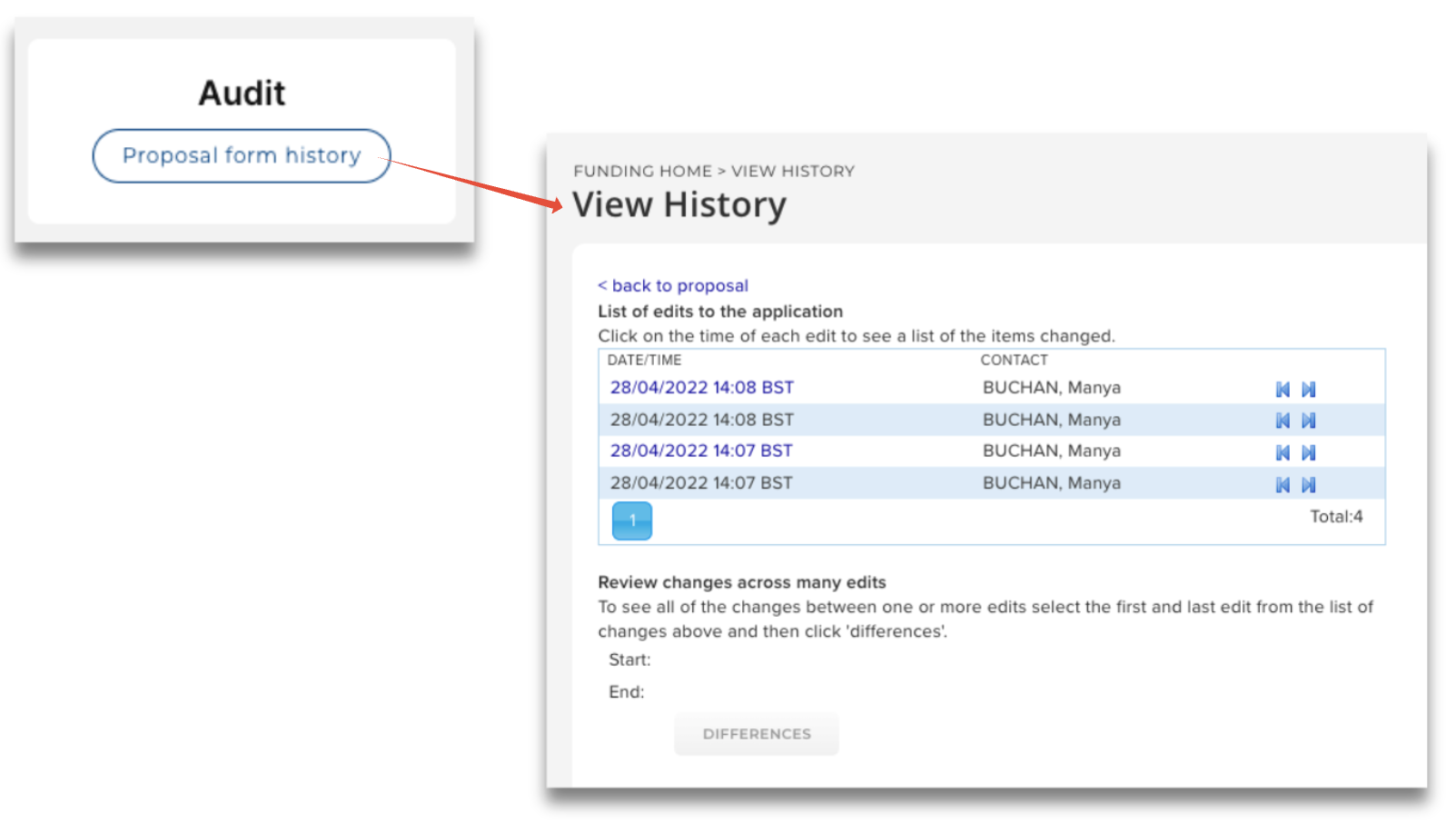 A new Audit tile has been added to the Proposal Details page, giving the Principal Investigator visibility of the Proposal form audit log, so they can view details of changes made to the Proposal form.