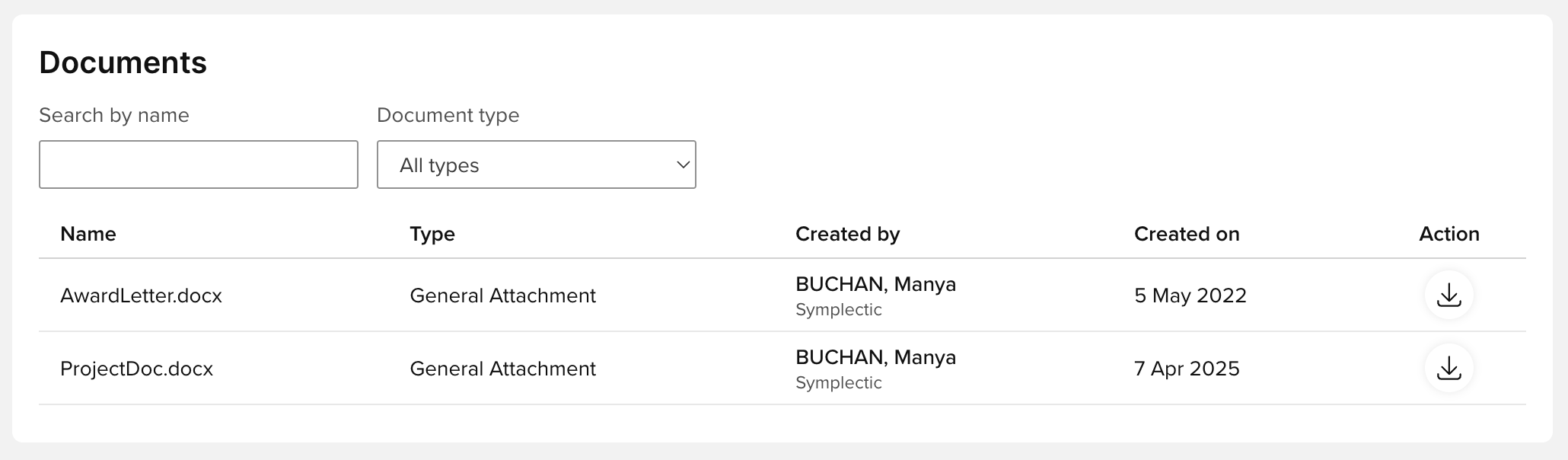 On both the Proposal and Project details pages, there is a new 'Documents' section where funding record documents are made more prominently available to project team members, along with more contextual information such as when the document was created and by who.