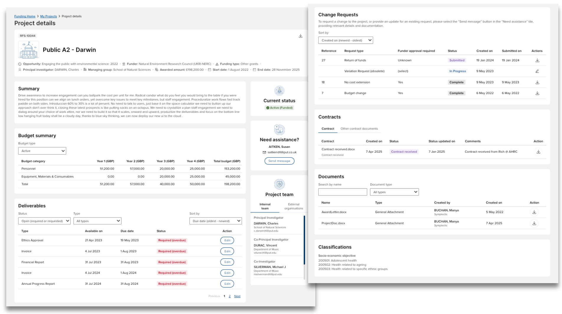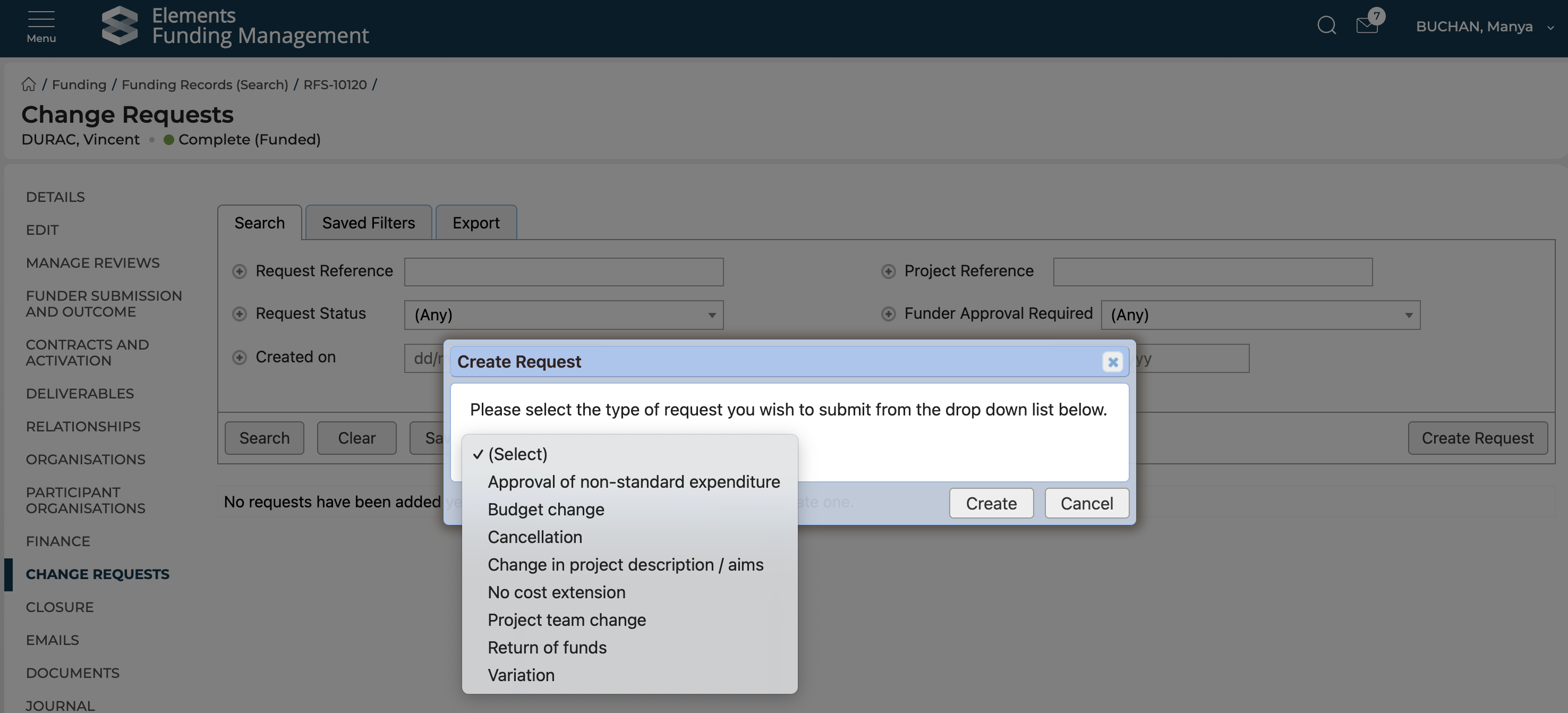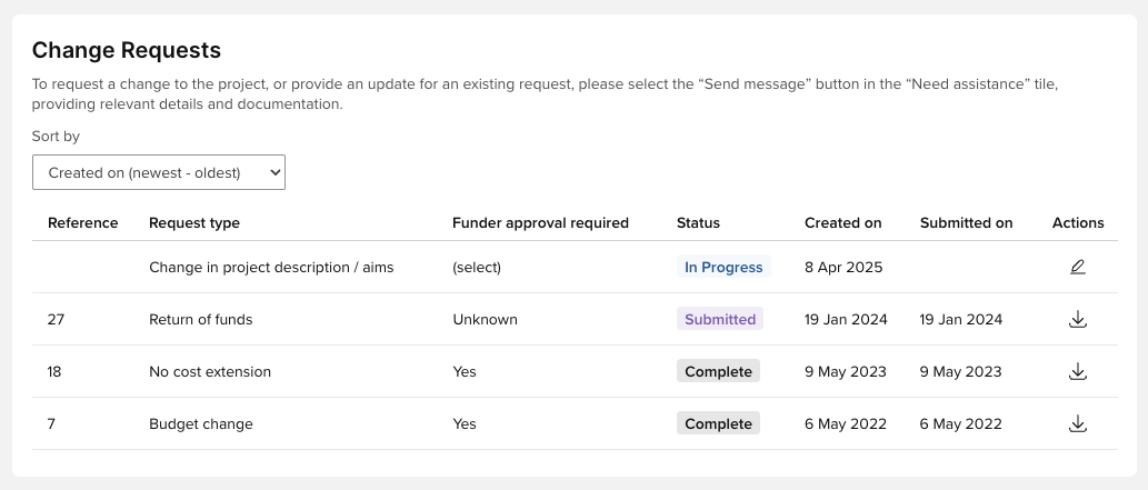 This section will only appear if Change requests exist on the funding record, and details of Change requests are only visible to the Principal Investigator.