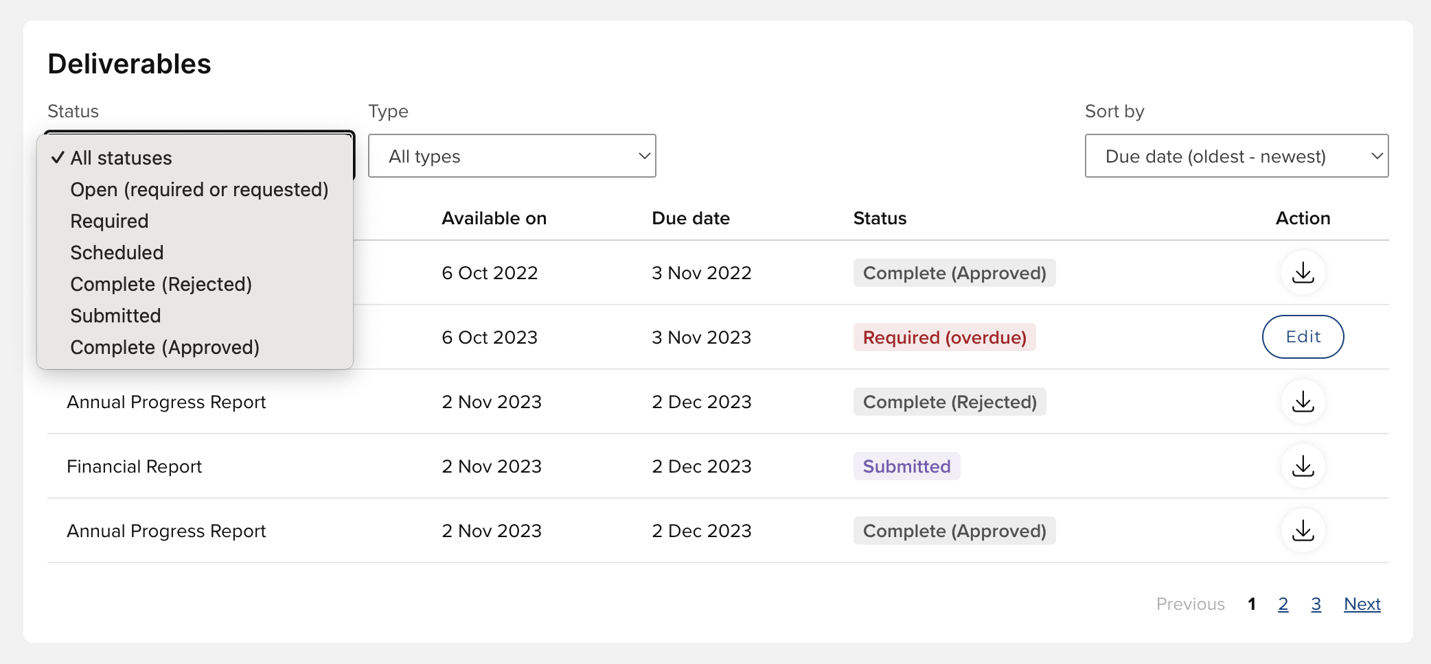 For Open deliverables, the 'Edit' action is available, which will open the deliverable form for completion and submission. Once the deliverable is submitted, the user can download a PDF of the deliverable form.