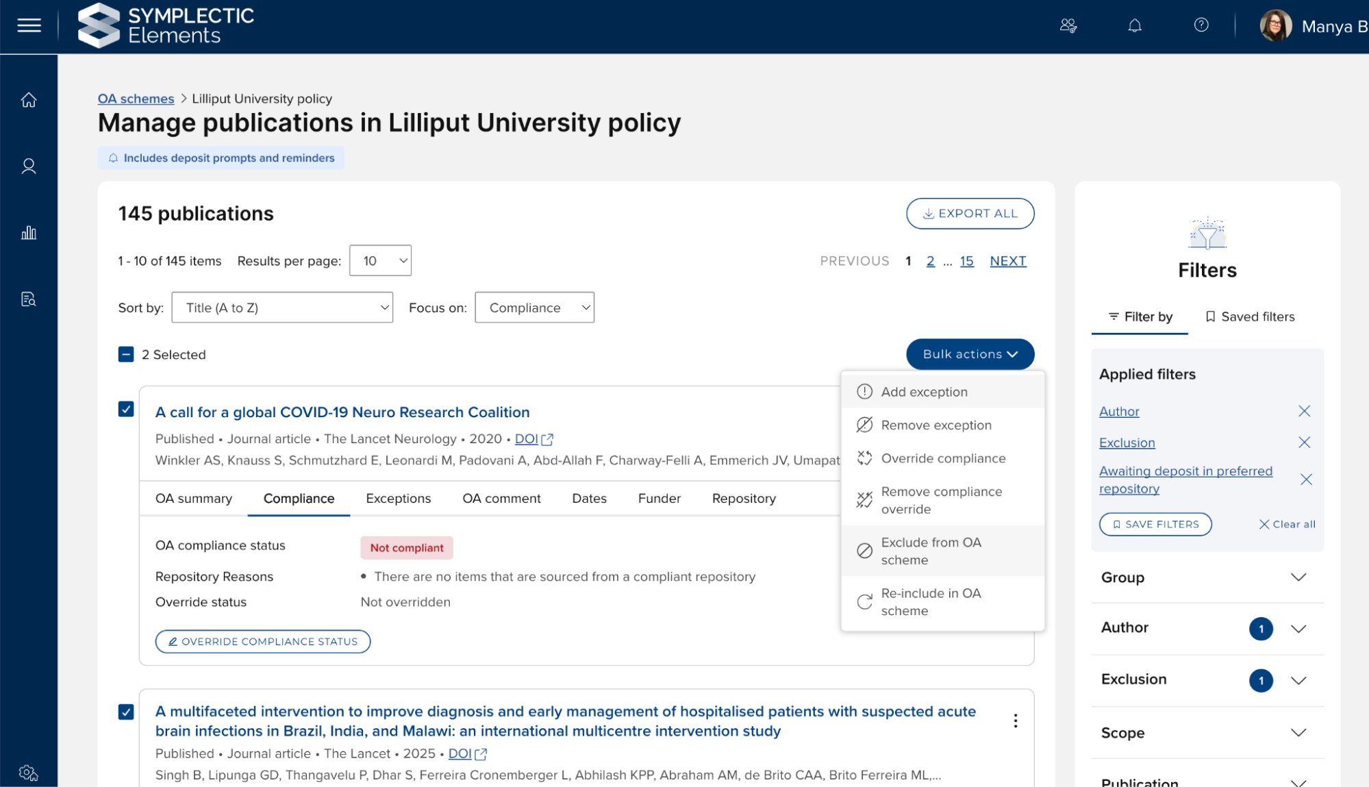 In this release, we have added bulk actions for overriding compliance and excluding publications from an OA scheme.
