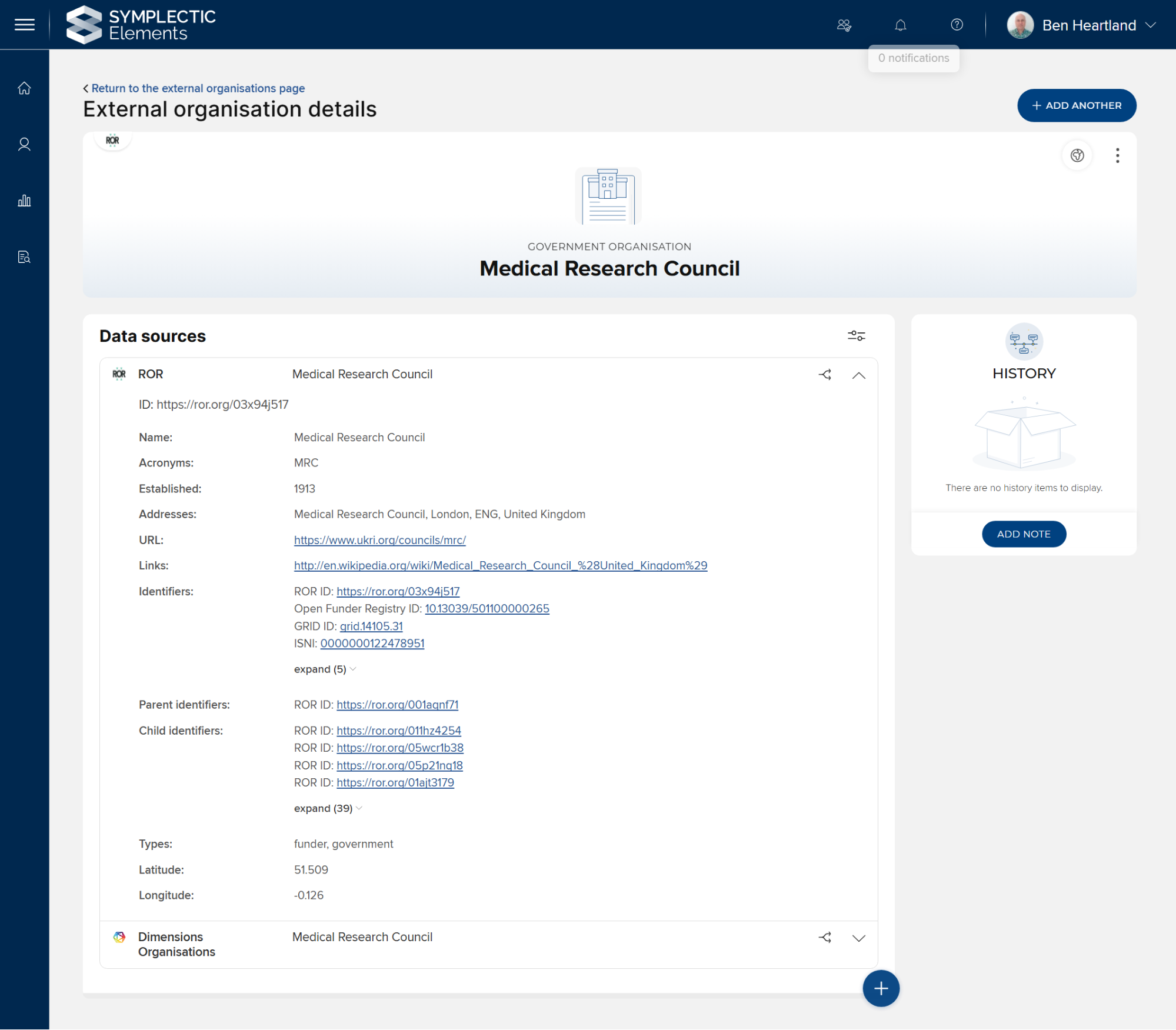 We have added the Research Organisation Registry (ROR) as a supplementary data source for the External Organisations Category, meaning that each External Organisation will be enriched with a metadata record from ROR, where available.