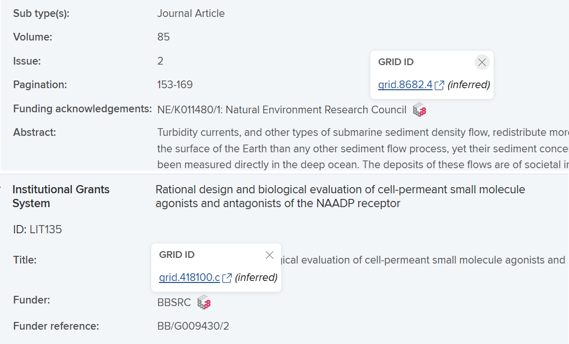 Image: GRID IDs inferred from publication funding acknowledgements (top) and a grant funder name (bottom)These inferred GRID IDs and the resolutions they create to External Organisations are available in the Reporting Database, allowing for reporting on the organisations identified within funders and funding acknowledgements.