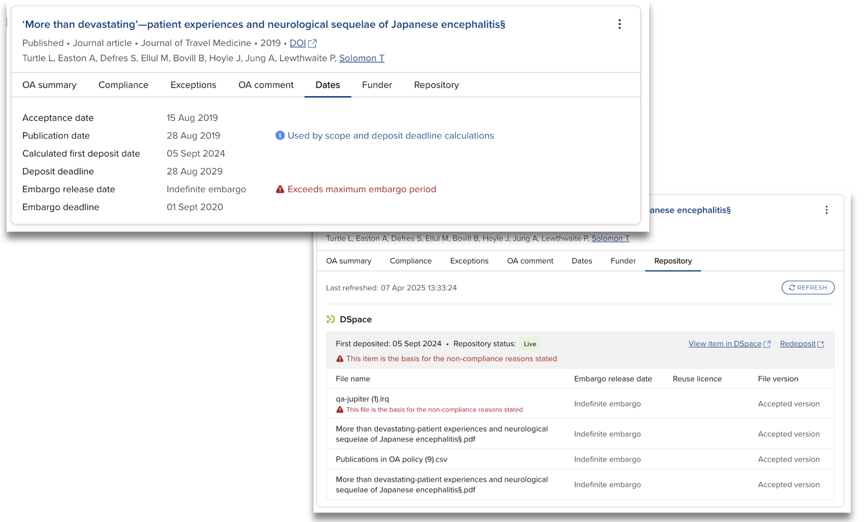 Improved warnings for when a deposit is outstanding or overdue, and when the embargo period and/or deposit deadline has been exceeded.