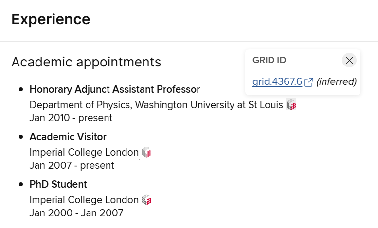 Image: Inferred GRID IDs in a user's profileThese inferred GRID IDs and the resolutions they create to External Organisations are available in the Reporting Database, allowing for reporting on the organisations identified within user profiles.