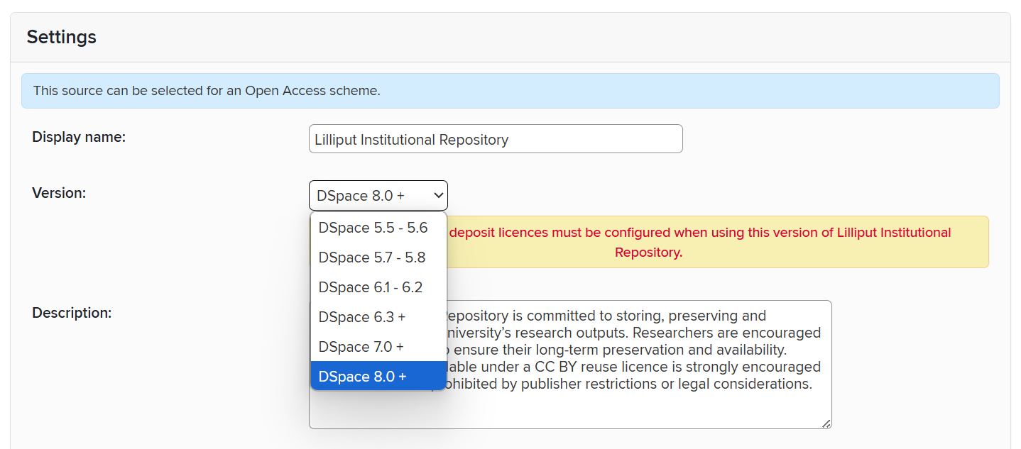Image: The DSpace 8 configuration option in the DSpace data source settingsIf upgrading a connected DSpace instance from 7.x to 8.x, the only action needed in Elements is to change the version number in the DSpace data source settings.