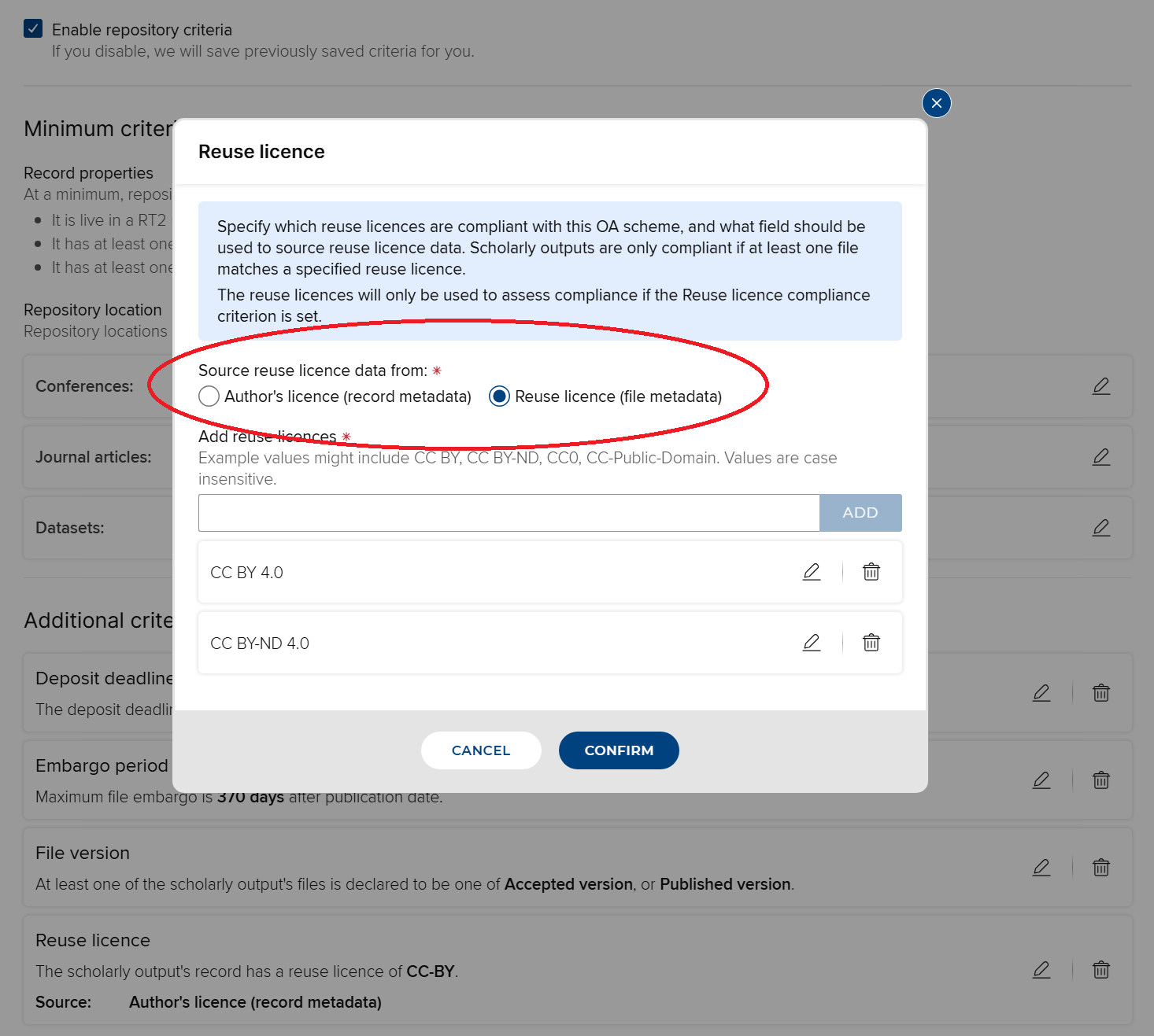 In its compliance calculations, OA Monitor can optionally be configured to use reuse licence metadata harvested from either the repository item or from individual files, depending on which is most suitable for your institution's set up.