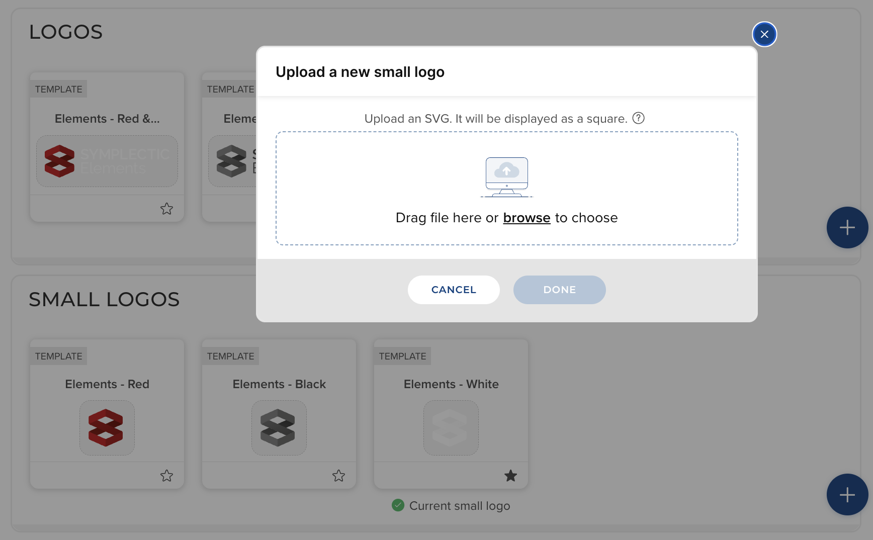 Uploading a small version of your logo to replace the default small logo, which will be set to a Symplectic Elements logo upon upgrade.