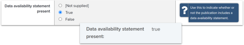 Image: The 'Data availability statement present' field in the manual entry form and displayed in a publication record
