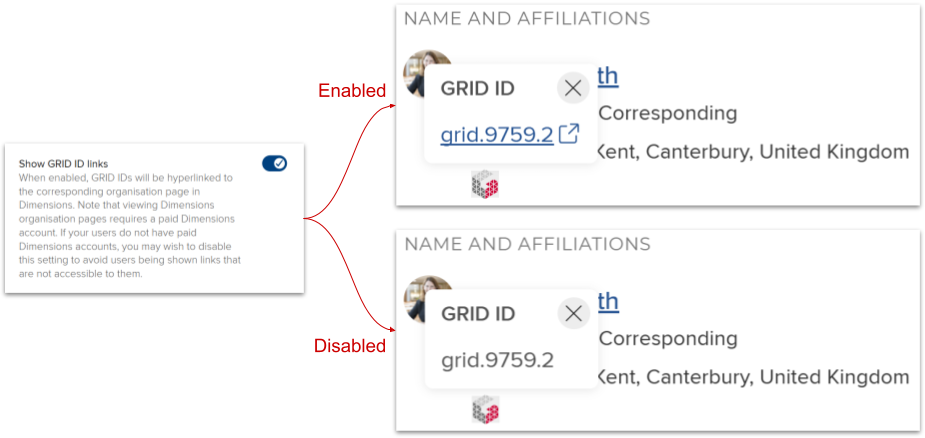 Following feedback that hyperlinks on GRID IDs are inaccessible to users without a paid Dimensions account, we have added a global option to enable or disable these links in the user interface.