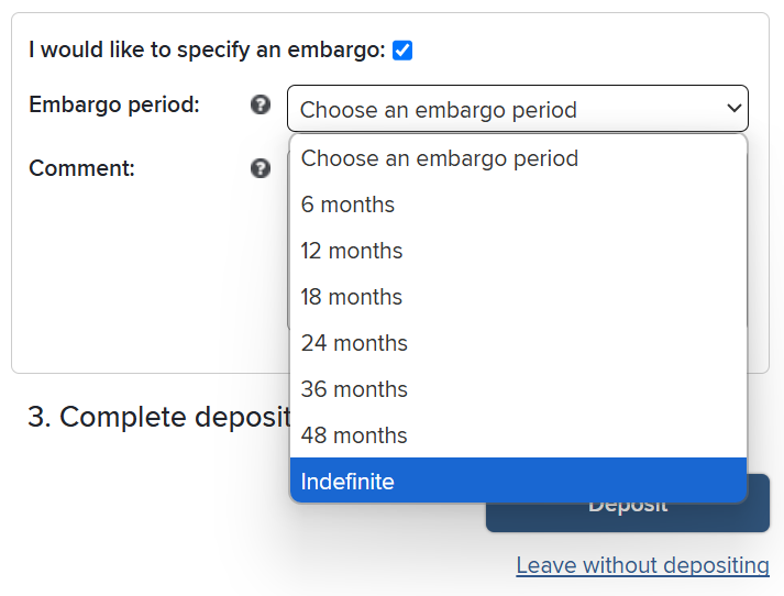 Image: The new ‘Indefinite’ option for embargo period when depositing to Figshare for Institutions