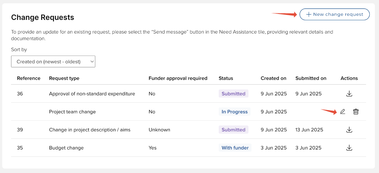 Authorised project team members can also delete any Change request that has not yet been submitted.