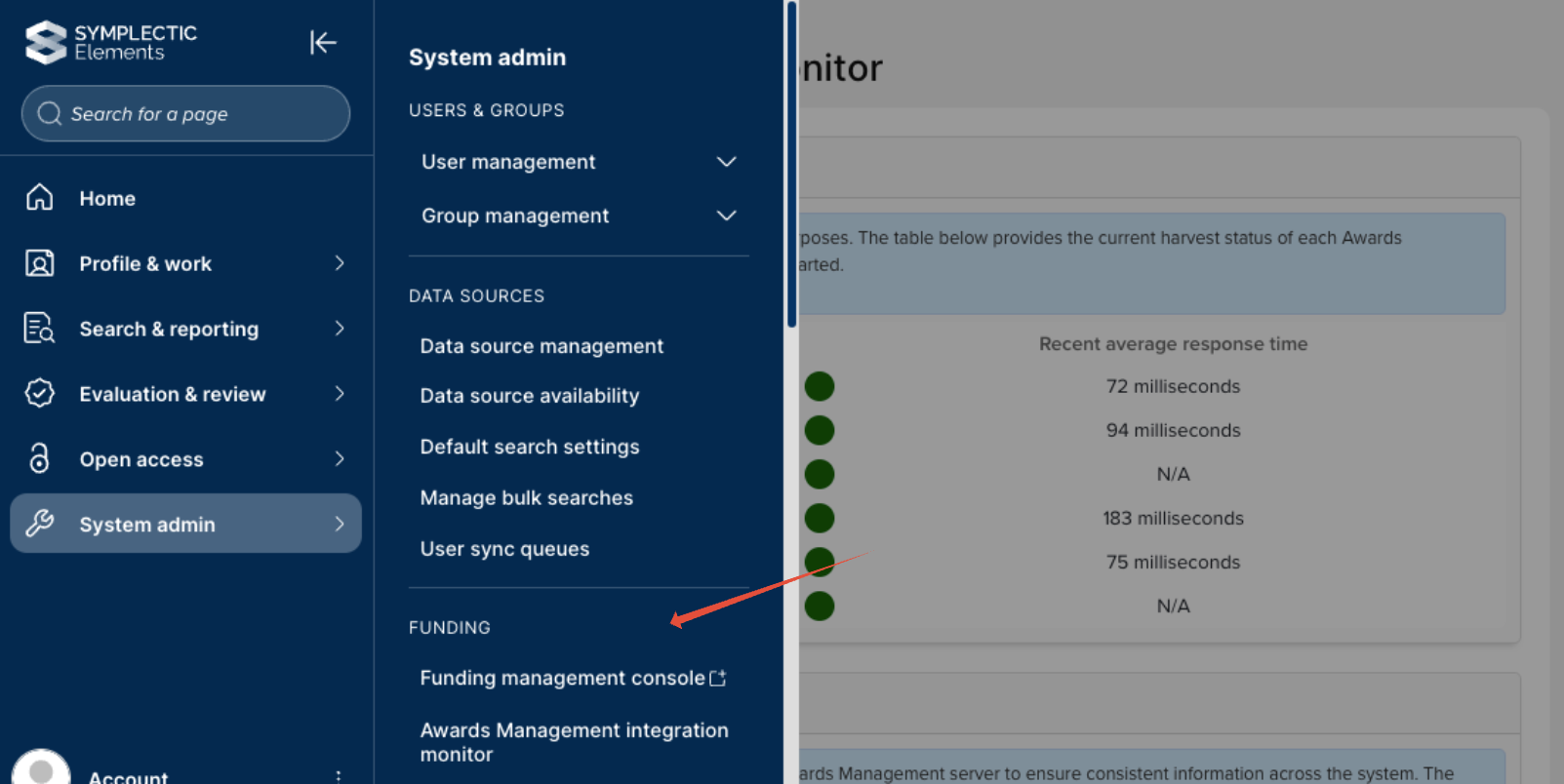 For administrators, the Funding management console and the Awards Management integration monitor are now available in the 'System admin' menu, under the 'Funding' header.