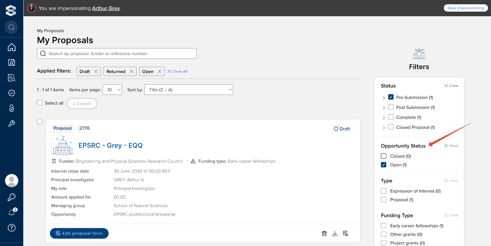 On the 'My Proposals' list page, we have introduced a new 'Opportunity status' filter than enables the user to filter their Proposals based on the status of the associated Funding Opportunity, enabling them to easily locate Draft or Returned proposals that can no longer be submitted, and/or proposals that should be deleted.