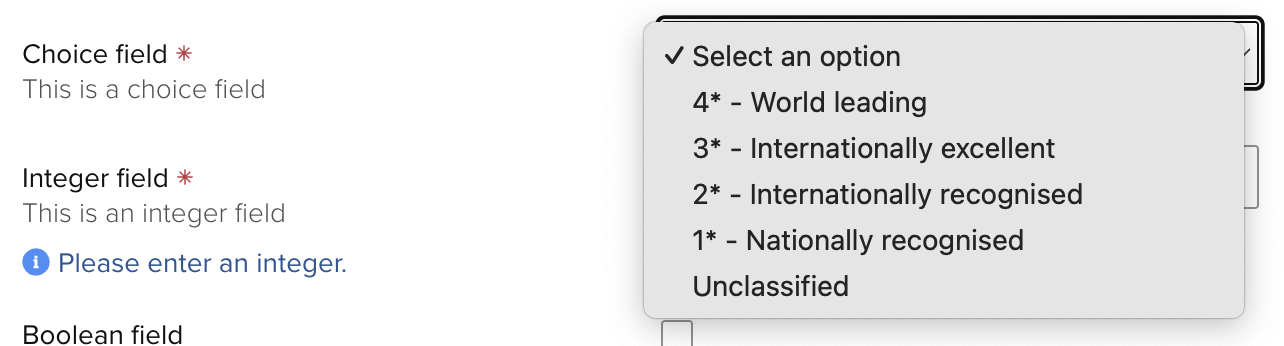 Choice | Drop-down choice field. You can set a numerical value applicable to each choice value, enabling downstream calculations (e.g. GPA, average score). | |
