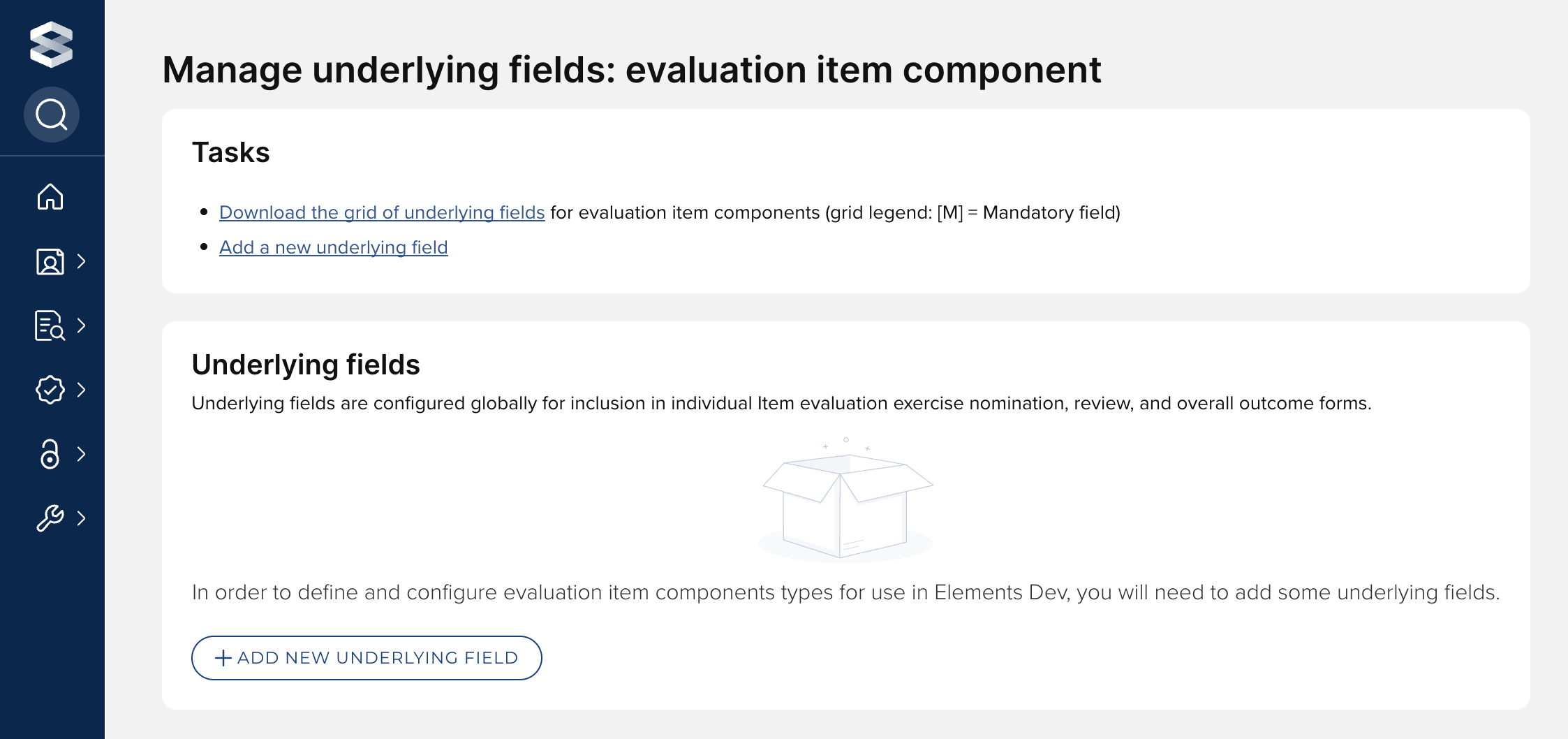 Once an underlying field has been created, it will be available to add to the desired form(s) via the Item evaluation exercise configuration space. You can view all configured underlying fields and their usage via the 'Download the grid of underlying fields' link in the 'Tasks' section.