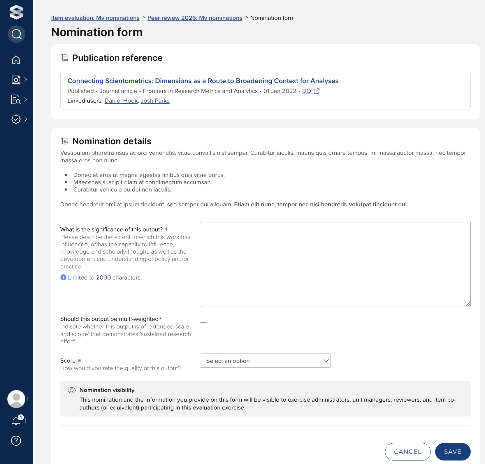 The first step in doing this is to configure your desired underlying fields for use within Item evaluation exercise forms. This can be done by System Administrators and Research Information Administrators via Evaluation & review > [ITEM EVALUATION] > Manage item evaluation fields.