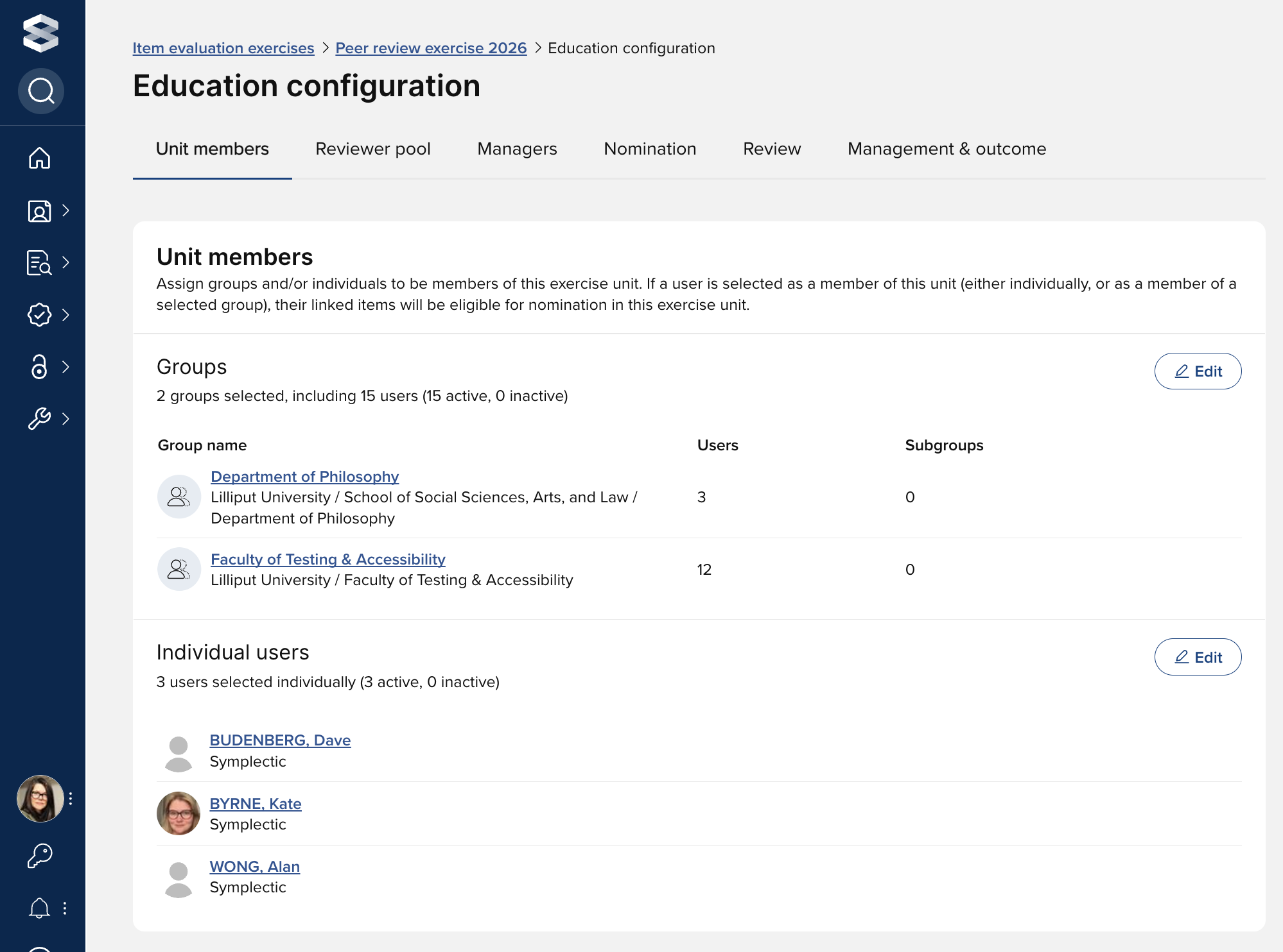 You can assign groups and/or individuals to be members of the exercise unit. If a user is selected as a member of the unit (either individually, or as a member of a selected group), their in-scope linked items will be eligible for nomination in the exercise unit.