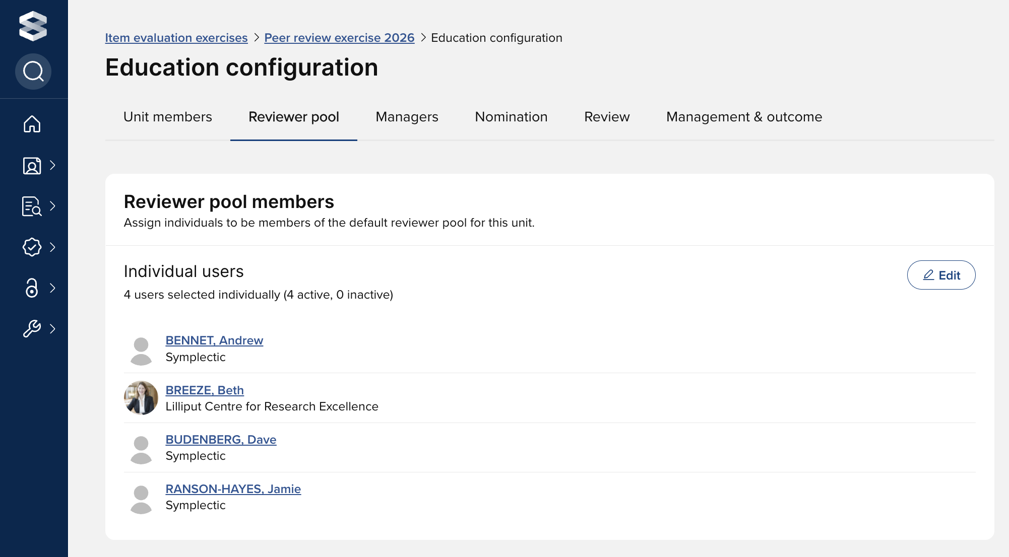 You can assign individuals to be members of the exercise unit's reviewer pool. If an individual is selected as a reviewer pool member, they will be available more prominently to be assigned reviews. Other users can be selected as reviewers on an ad hoc basis without being a member of the reviewer pool.