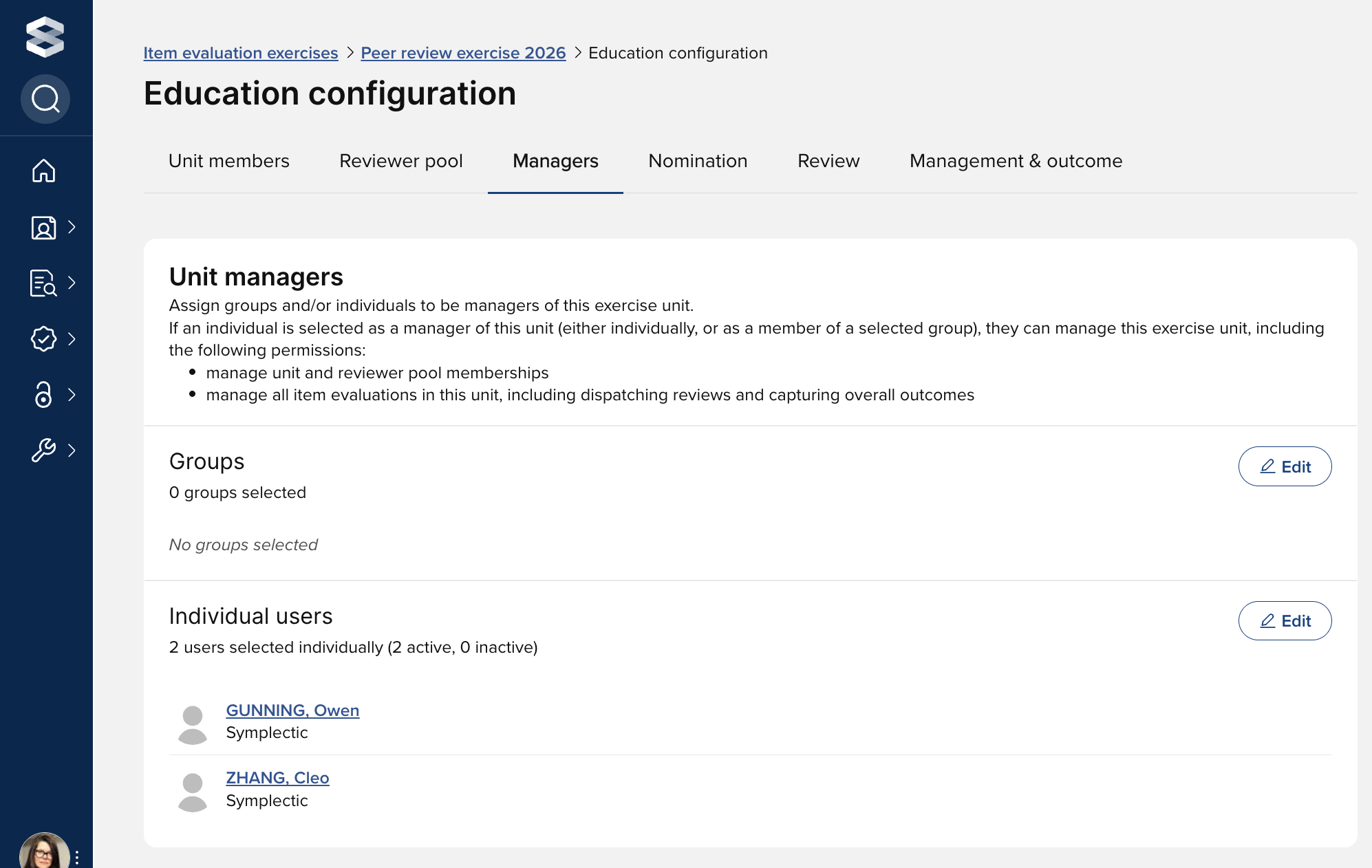 You can assign groups and/or individuals to be managers of the exercise unit. If an individual is selected as a manager of the unit (either individually, or as a member of a selected group), they can manage the exercise unit, including the following permissions (described in greater detail in the the 'User roles and permissions in Item evaluation' support article):