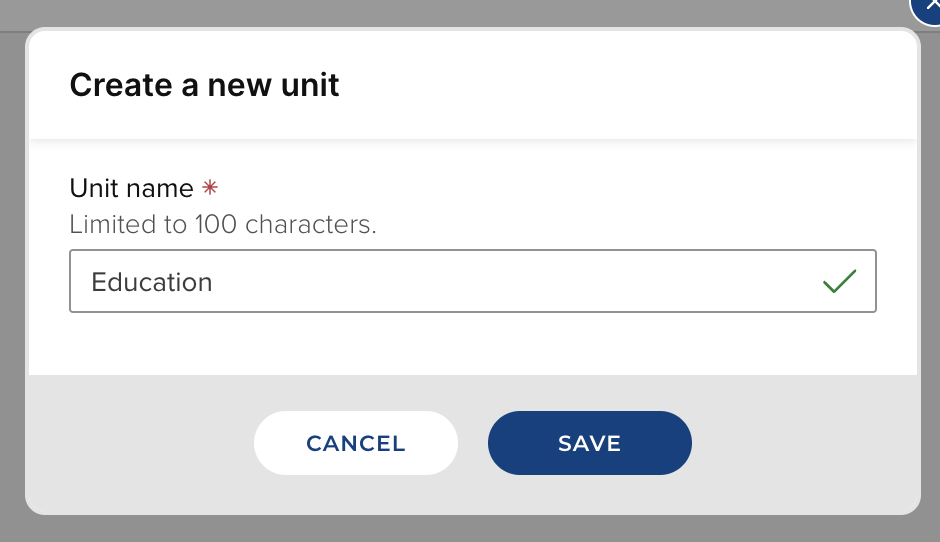 To create a new unit, select the 'Create new unit' button in the top right-hand corner of the screen.