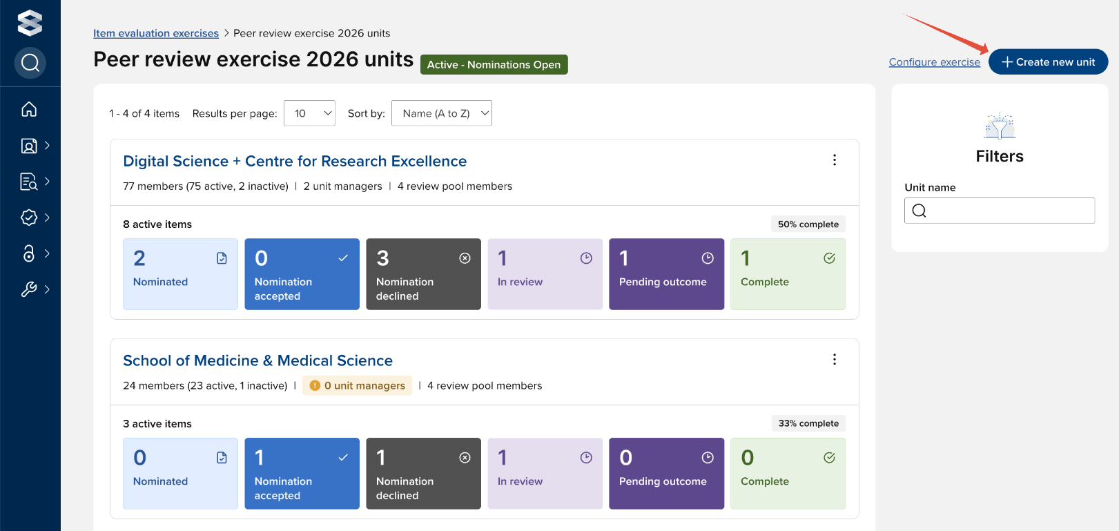 Exercise units can be created, configured, and managed by authorised users via Evaluation & review > [ITEM EVALUATION] > Item evaluation exercises, and selecting the desired exercise. You can also navigate to the unit list page from the exercise configuration pages via the 'Manage units' link in the top right-hand corner.