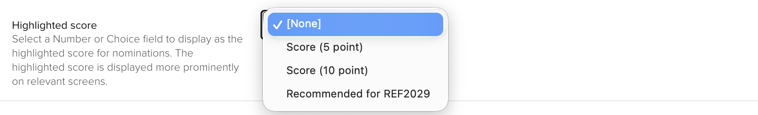 As the nomination form enables any number of scores to be captured, you can identify a ‘highlighted score’. Highlighted scores are more prominently displayed on key screens, making outcomes easier to interpret.