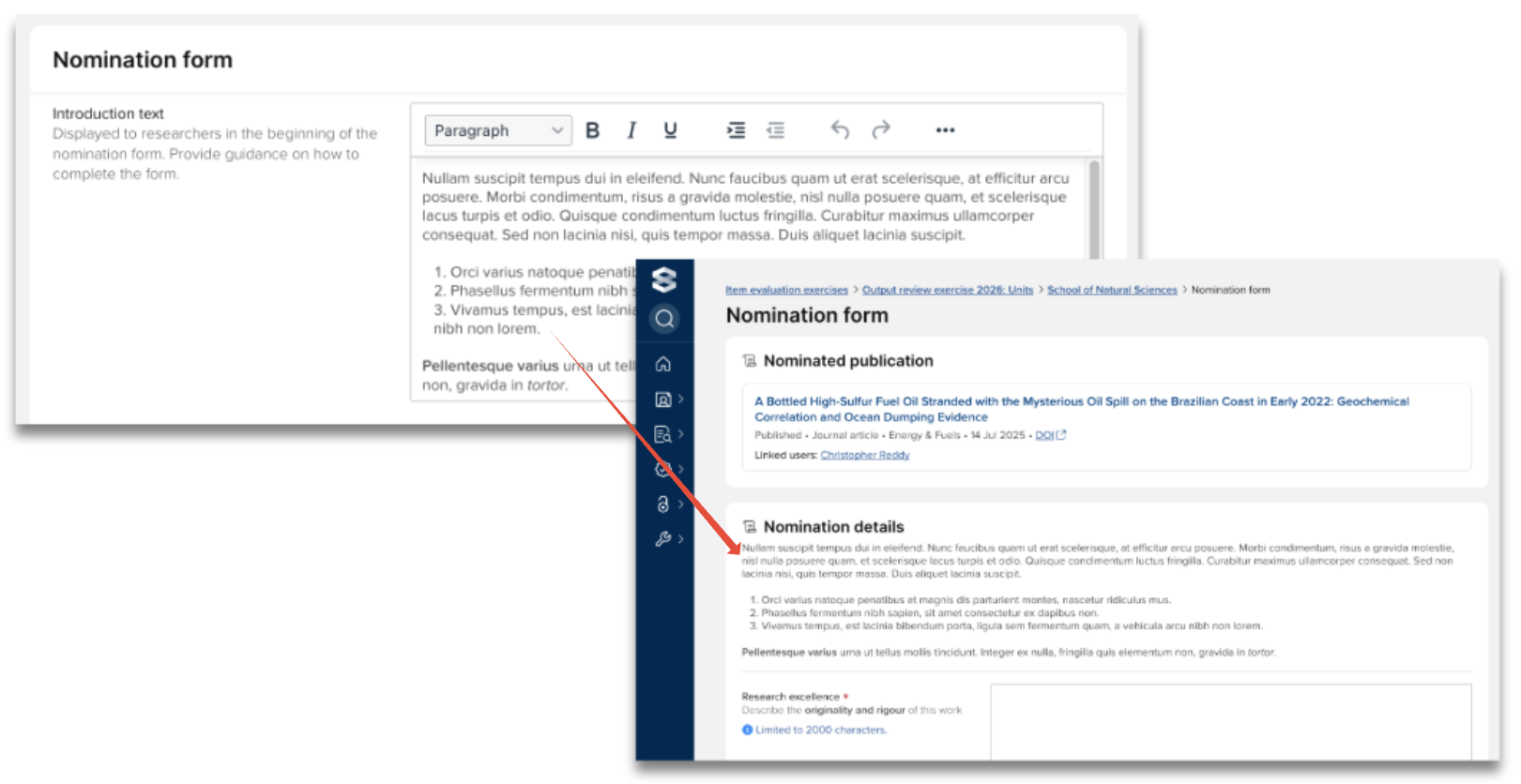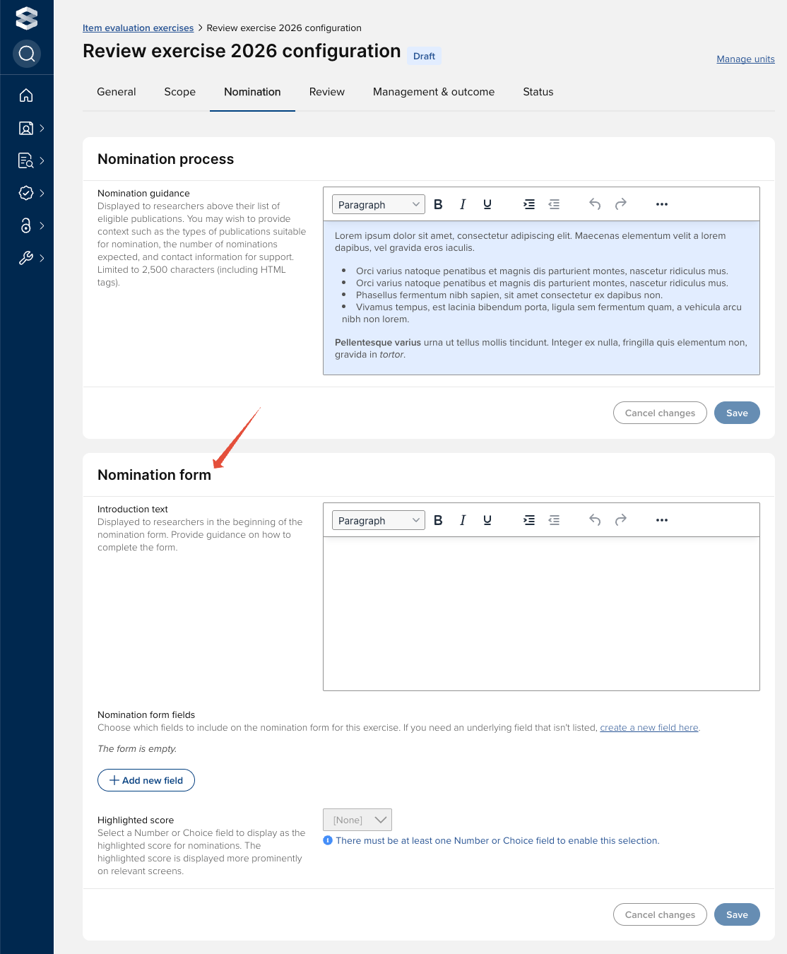 If desired, you can configure a nomination form for researchers to complete when nominating an item for evaluation in the exercise (e.g. you may wish to ask them information about the item they're nominating).