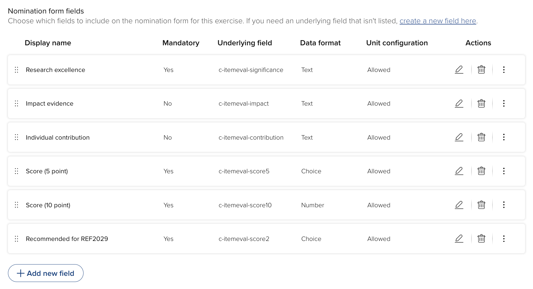Underlying fields can be created by System Administrators and Research Information Administrators via Evaluation & review > [ITEM EVALUATION] > Manage item evaluation fields. Further details are available in this support article.