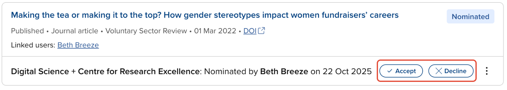 Declining a nomination indicates that the item is not to be peer reviewed and will proceed no further in the exercise. Decline reasons can be provided, and these are visible to System Administrators, Research Information Administrators, exercise unit managers, and users linked to the item.