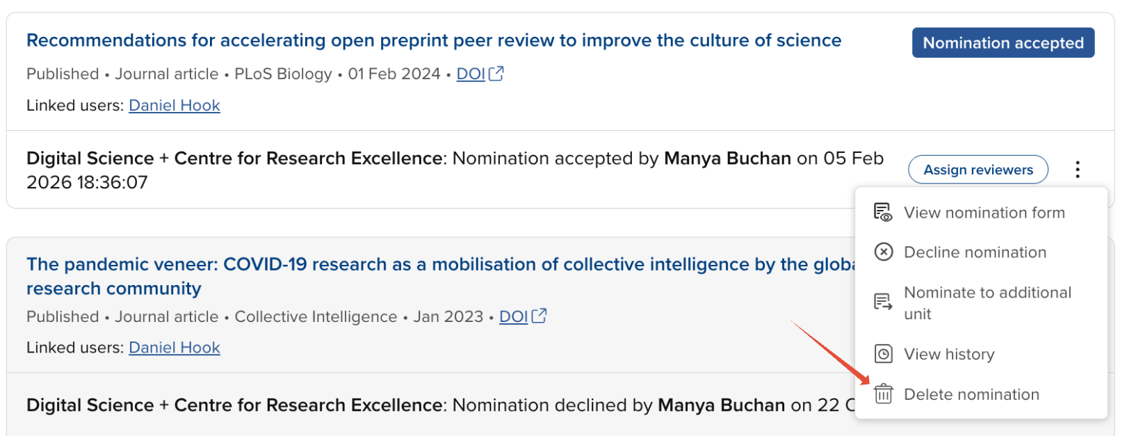 Deleting a nomination deletes the nomination and outcome forms (if present), and any associated reviews, and reverts the status of the nomination to 'Available for nomination'. The action cannot be undone, but the item can be nominated again in future if desired.